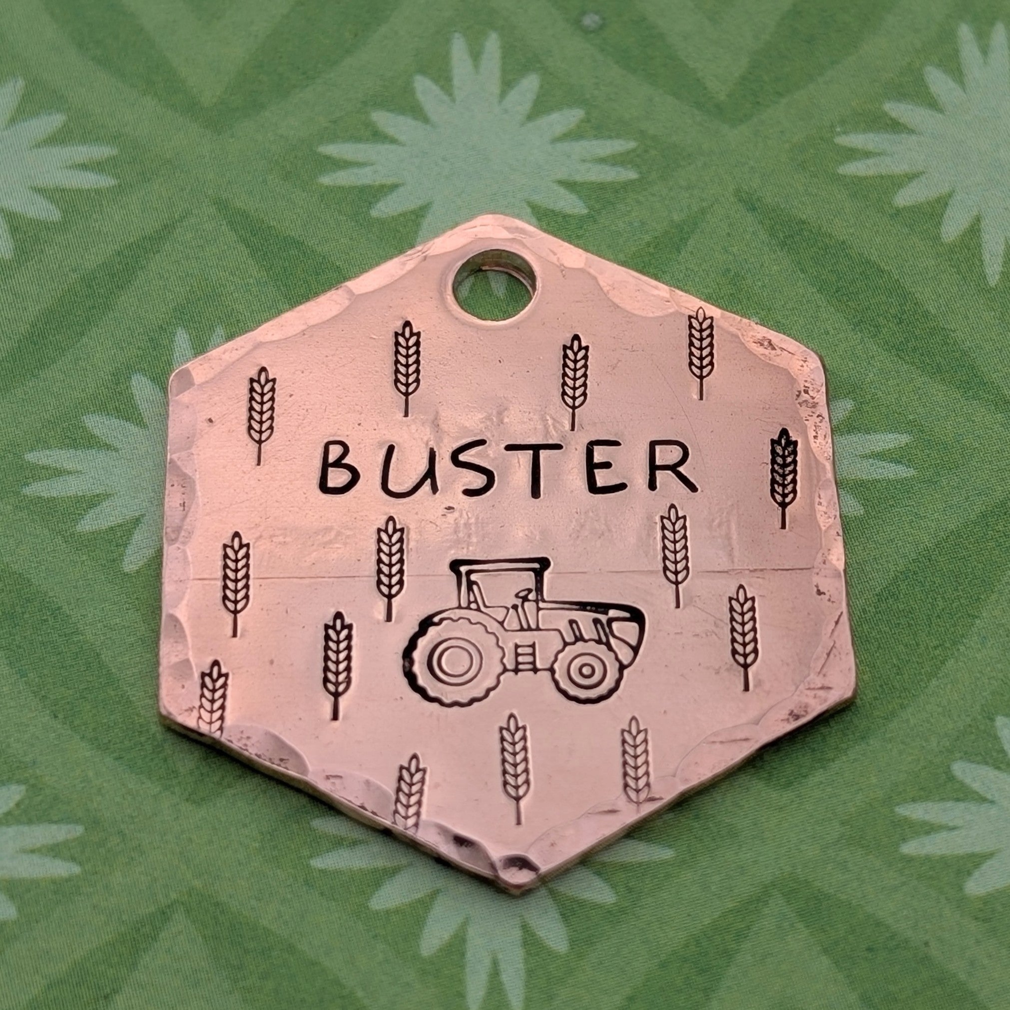 **Because of the design of this tag, some variations may be necessary to accommodate longer dog names.** All tags are hand stamped, rather than laser...